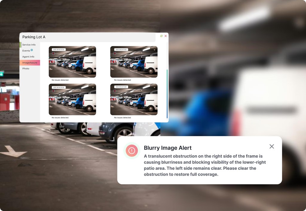 ImageAssure analyzes camera images in real time to detect blur, obstruction, camera movement, and other issues that compromise video quality. Instead of discovering problems after an incident, teams receive alerts the moment image conditions change, helping ensure footage remains reliable and evidence-ready.